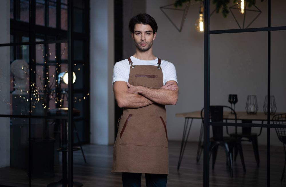 Универсальный фартук бармена, бариста, официанта. Может служить отличным подарком и для людей творческих профессий — художников или скульпторов — и для всех, кто любит мастерить что-то своими руками.